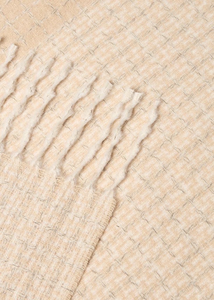 - It features a textured design with a subtle pattern and finished tassels.